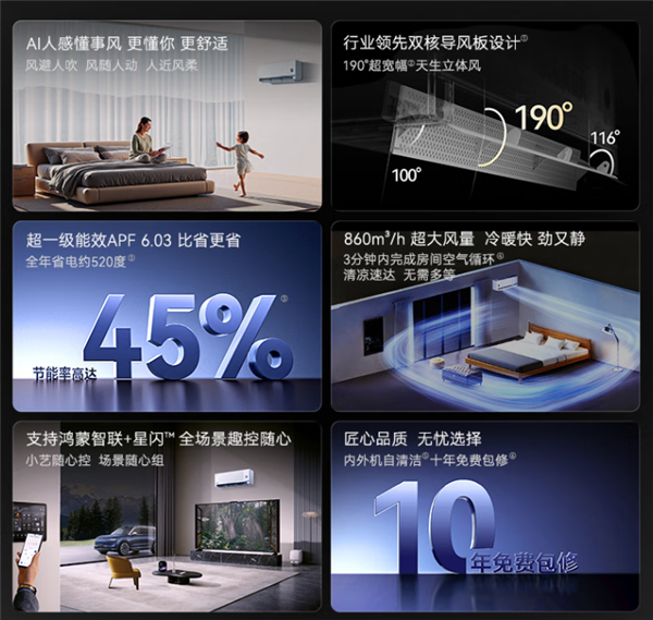 💡 **卓越的节能与强劲风量**: 该空调实现了超一级能效APF6.03,官方宣称全年可节省约520度电,显著降低用户的用电成本。同时,其860m³/h的超大风量和超宽扩压风道设计,确保房间空气每3分钟即可循环一次,最远送风距离可达12米,快速实现室内空气的均匀舒适。