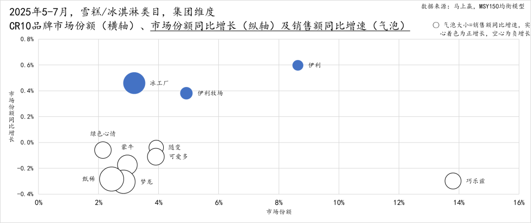 进一步观察类目集团/品牌的集中度情况,可以看到,在 2023–2025年5-7月期间,雪糕/冰淇淋类目的集中度整体保持相对稳定。集团层面,CR10集团的类目内市场份额从 2023 年的 66.5% 小幅下滑至 2025 年的 65.5%,而 CR20 则基本维持在 77% 左右,头部集团的市场份额略有削弱,但中腰部集团及时补位,整体变化不大。