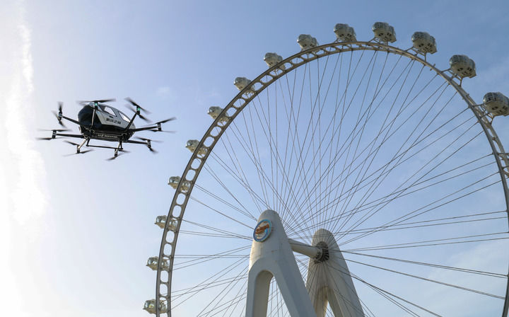 在深圳市宝安区城市空中交通运营示范中心,亿航eVTOL航空器进行展示飞行(2025年4月16日摄)。