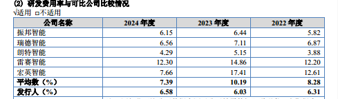 需要说明的是,在上述时间段内,精创电气的研发费用率分别为6.31%、6.03%、6.58%,同行可比公司平均值分别为8.28%、10.19%、7.39%,研发费用率始终低于同行均值。