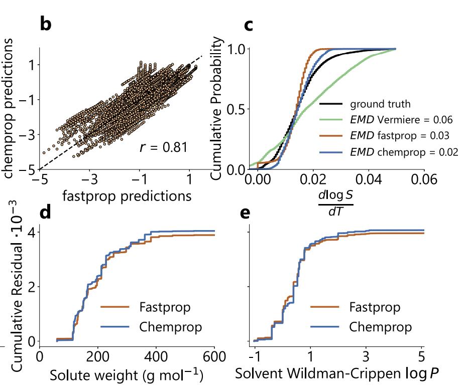 针对这一痛点,美国麻省理工学院研究团队结合化学信息学工具与全新有机溶解度数据库 BigSolDB,在 FASTPROP 与 CHEMPROP 模型架构的基础上进行了改进,使模型能够同时输入溶质分子、溶剂分子及温度参数,直接对 logS 进行回归训练。