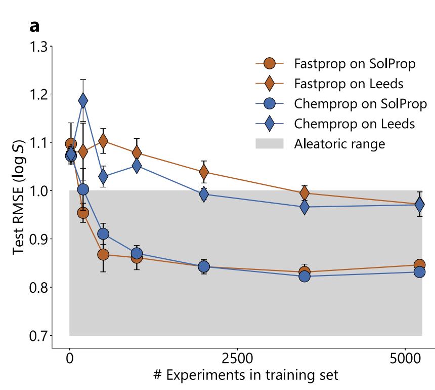 训练数据量实验如下图所示,FASTPROP 与 CHEMPROP 虽分子表征不同,但性能收敛于相似极限:SolProp 测试集上约 500 条实验(≈5,000 数据点)即可达平台期,Leeds 测试集上 CHEMPROP 需约 2,000 条实验(≈20,000 数据点)。