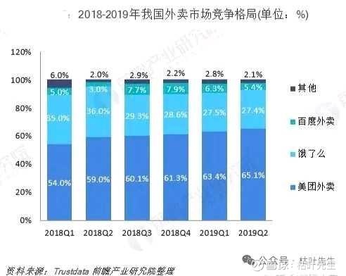 然而,经过一年的交锋,2019年饿了么仍没能东山再起,美团份额继续提升至65%。图2反映了18年一季度至19年二季度淘美之争发动后,市场主要竞争对手的份额变化。