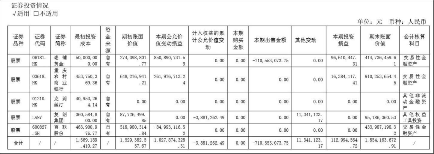 截至目前,豫园股份投资的5只证券,有两只在上半年贡献了大额投资收益,分别是老铺黄金(9661.04万元)、重庆农村商业银行(1638.41万元)。其中,尤以对老铺黄金的低成本投资,在短期内取得了超高回报。