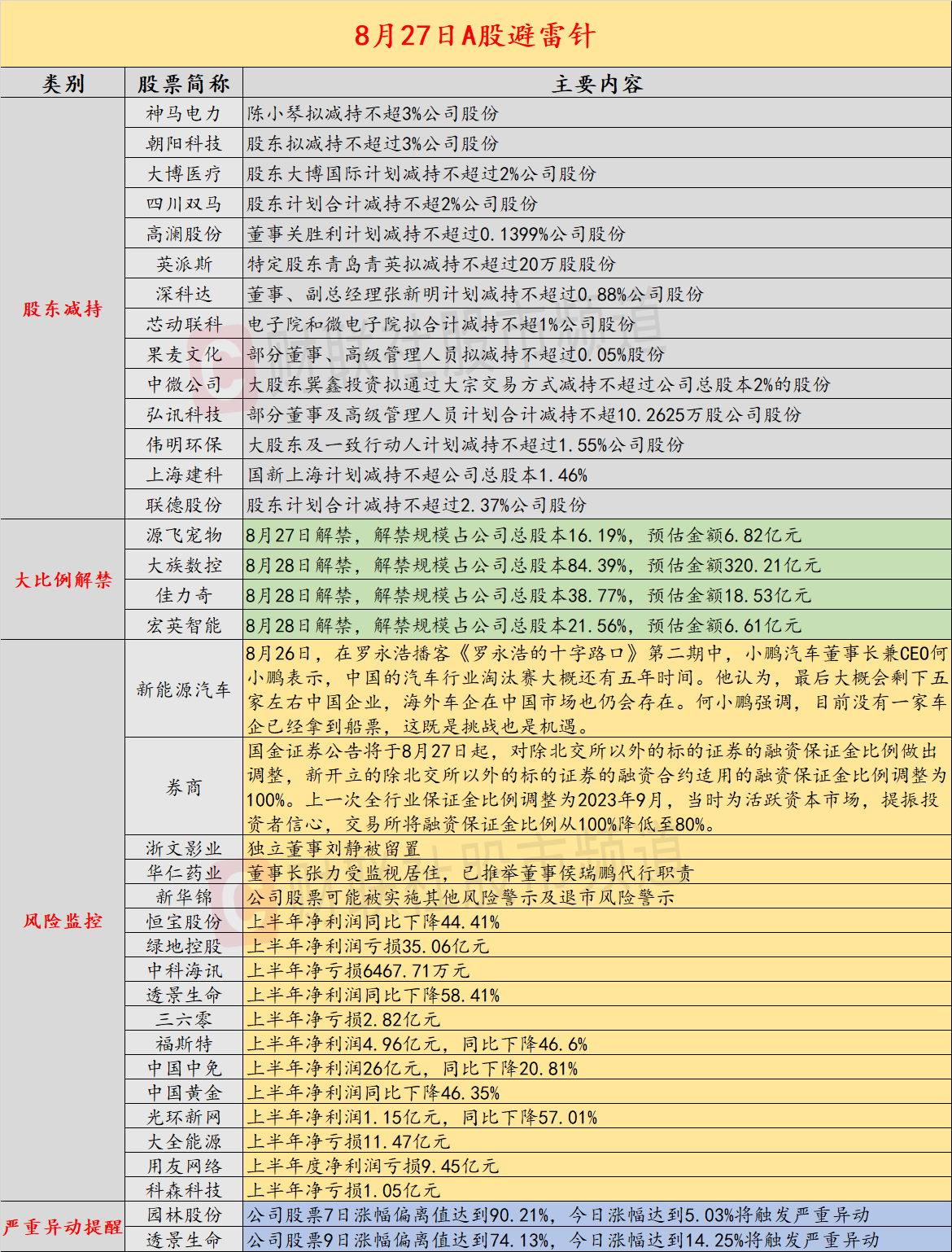 导读:财联社8月27日投资避雷针,近日,A股及海外市场潜在风险事件如下。国内经济信息方面包括:1)国金证券上调融资保证金比例;2)阿里云百炼宣布部分模型上下文缓存降价;公司方面重点关注包括:1)华仁药业董事长张力受监视居住,已推举董事侯瑞鹏代行职责;2)恒宝股份上半年净利润同比下降44.41%;海外市场重点关注包括:1)国际原油期货结算价跌超2%;2)高盛称美股“金发姑娘之夏”行情即将结束,美国经济增长担忧加剧。