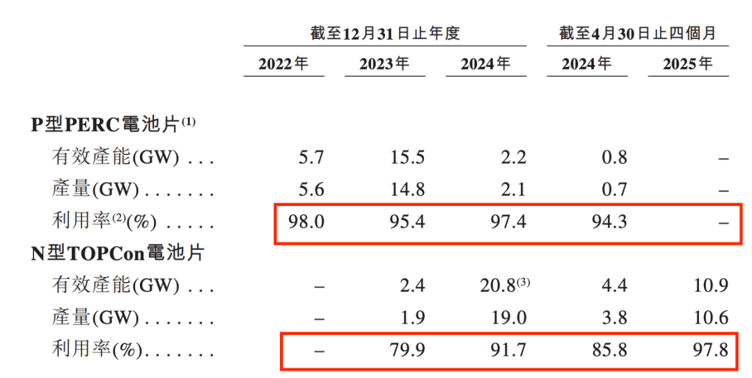 截至2025年4月30日止4个月,英发睿能的光伏电池片有效产能约为10.9GW。报告期内,其P型PERC电池片的产能利用率分别为98%、95.4%、97.4%和零;而N型TOPCon电池片的产能利用率则分别为零、79.9%、91.7%和97.8%。