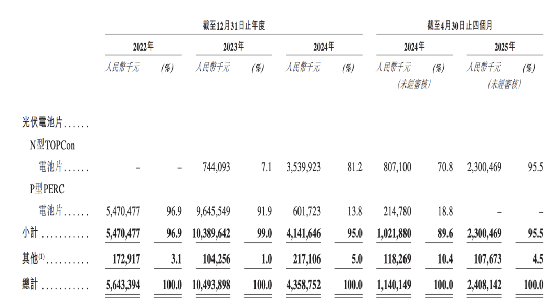 2022年、2023年、2024年及2025年前四个月(以下简称“报告期内”),公司的主要产品包括P型电池片和N型电池片。