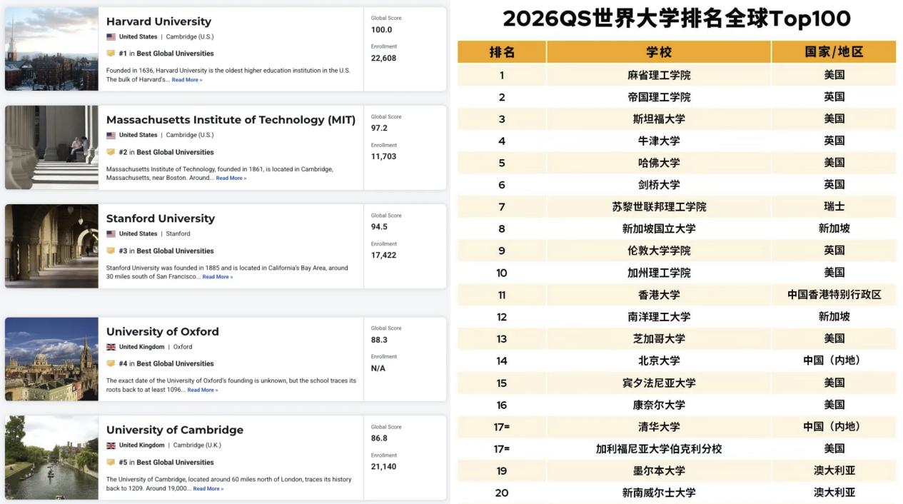 最经典的是世界大学排行榜,几乎每年每个机构发布的榜单都是天差地别,如今年6月US News和QS先后公布的最新全球大学排名。