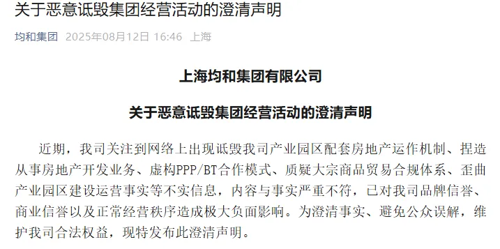 8月12日,均和集团通过其官方公众号发布声明,就外界对其产业园区配套房地产及房地产开发相关业务的表述作出专门澄清。