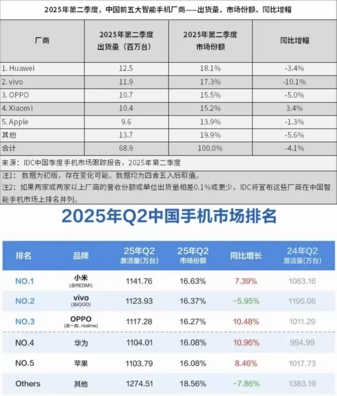 就在这个月,研究机构IDC和BCI都发布了2025年第二季度国内智能手机市场份额数据,双方数据较为接近,不过IDC给出的前五名是华为、vivo、OPPO、小米和苹果,而BCI的前五名是小米、vivo、OPPO、华为、苹果。