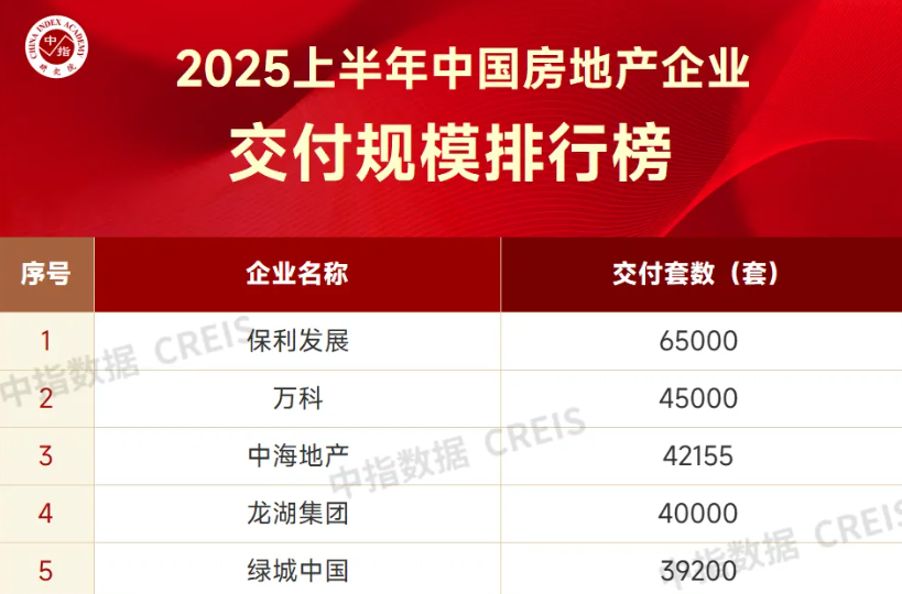 7月21日,中指研究院发布了2025年上半年房地产交付排名:保利发展荣登榜一大哥,6.5万套。