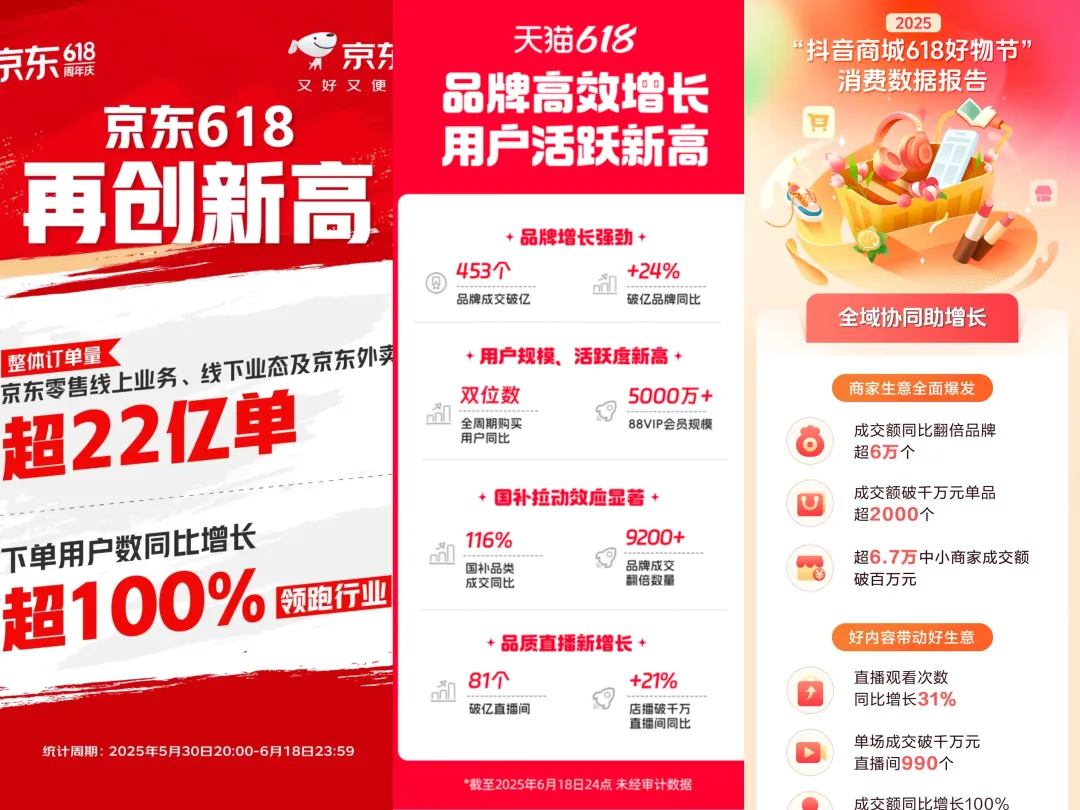 同样的今年618大促,作为平台取消仅退款和头部主播退潮后的“练兵场”,猫狗抖都表示自己再创新高,标识一个赛一个醒目,数字也是一个比一个夸张。