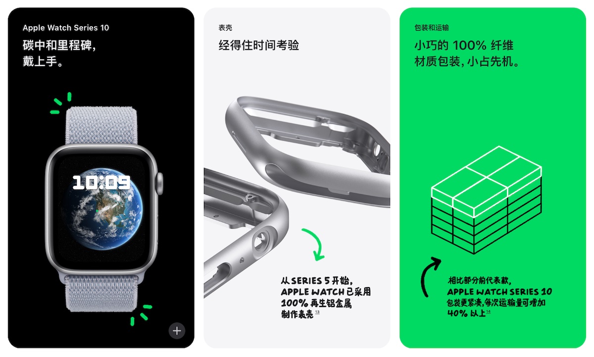 苹果自 2023 年 9 月推出 Apple Watch Series 9 和 Watch Ultra 2 起,便宣称它们是公司首批碳中和产品。随后,Apple Watch Series 10 在搭配编织单圈表带、运动回环表带或米兰尼斯回环表带时,也被列入碳中和范围。