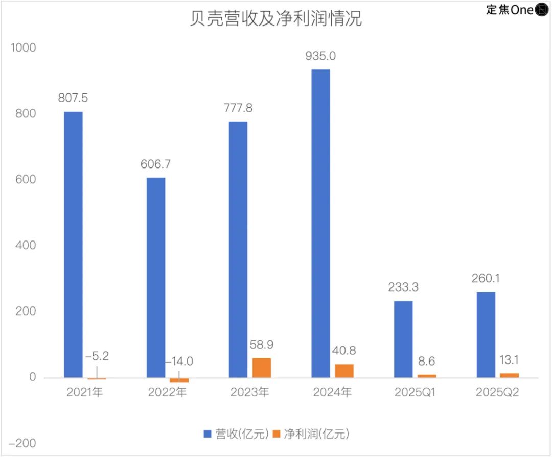 要理解贝壳的业绩困境,需回顾其过去几年的表现。从2021年到2025年第二季度,贝壳的业绩轨迹堪称“过山车”: