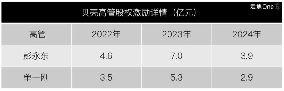 2022年5月,贝壳推出股权激励计划,宣布向彭永东和单一刚分别派发7182万股和5386万股。按照当时的股价计算,这分别价值25亿人民币和18亿人民币。这些股份分5年解锁,从2022年到2024年,两位高管已经获得的股份价值分别达到15.5亿和11.6亿。