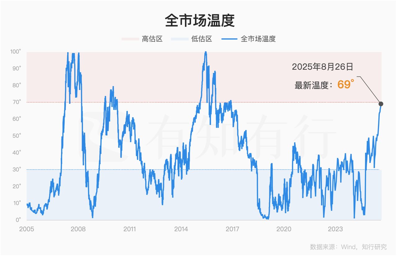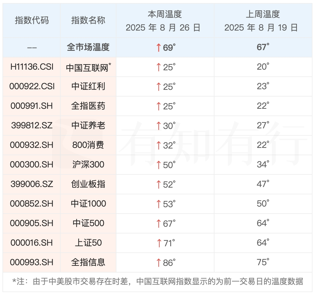 先来看最近一周的股市表现。最近一周A股加速上涨,上证指数已经来到了 3900 点附近,中证全指过去一周上涨 4.24%。普涨局面带动全市场温度继续提升,我们最新的全市场温度来到了 69°。