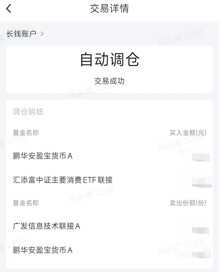 为什么可以如此高效率地实现调仓呢?是因为长钱账户内部有「鹏华安盈宝A」这只货币基金。这只货币基金在交易上,具备当天赎回转申购的能力。长钱账户可以在当天赎回鹏华安盈宝A,当天就去申购800消费基金,这只货币基金很好地充当了中转站的角色,且货币基金申购赎回全程不会收取手续费,所以也不会付出额外的费用。