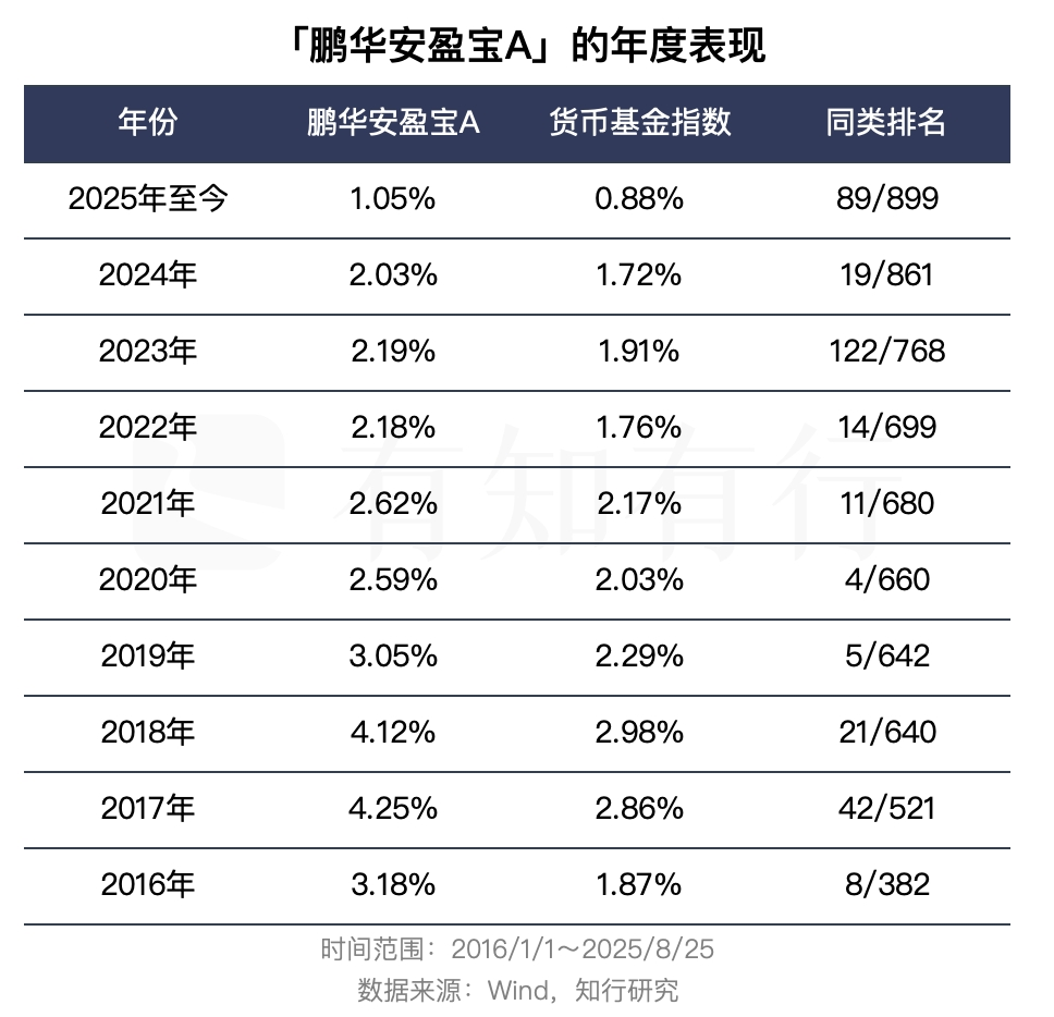 长钱账户挑选的当作投资备用金的货币基金,同时要兼顾投资性和交易便利性。从下图能看出来,「鹏华安盈宝A」的费率低,业绩不错,业绩稳定性也好。虽然货币基金收益率在下滑,但能多赚一些总归是好的。再加上它在交易上的便利性,很好地充当了投资备用金的角色。这种细节的选择和处理,虽然大家很难感知到,但却体现了长钱账户对于用户体验的关注。