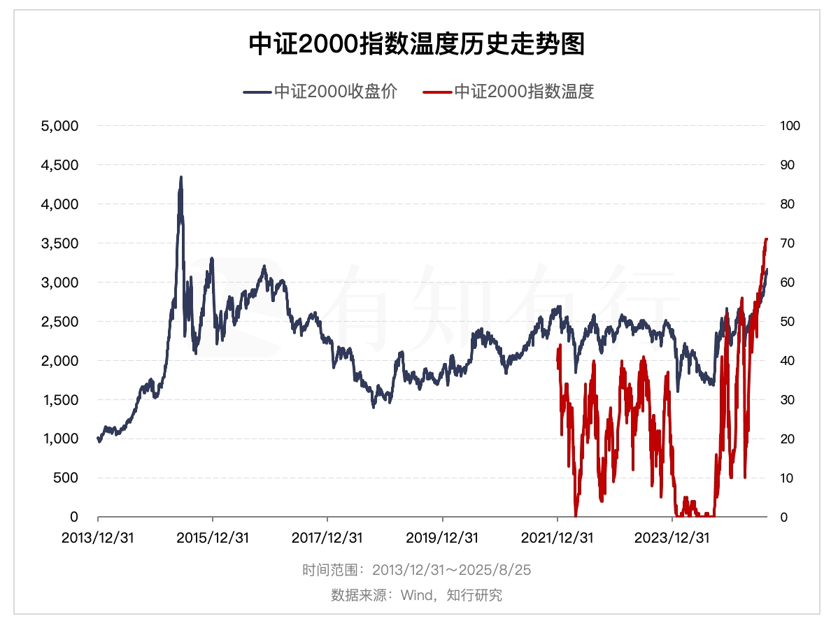蓝色的线代表了中证2000的收盘价变化情况,红色的线代表了中证2000的温度情况。为了更好地体现中证2000指数估值在牛熊周期中的变化,中证2000的温度计展示了 2015 年以来指数估值所处的位置情况,中证2000的最新温度在 70° 以上,处于高估区间,比目前估值还高的只剩下 2015 年那轮牛市高点了。