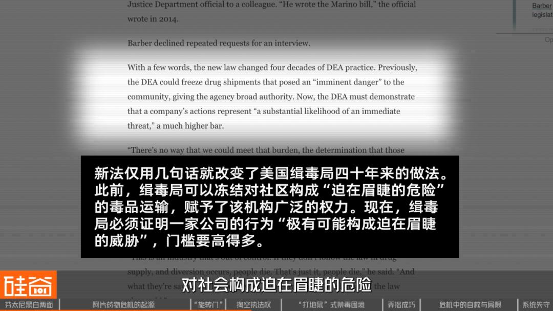 而修改后,DEA必须“证明”该公司行为“极有可能构成即时威胁”,这让DEA几乎无法迅速阻断这些可疑供应链。因此,即使明知所售药物流向可疑,执法部门也难以“立即”干预。
