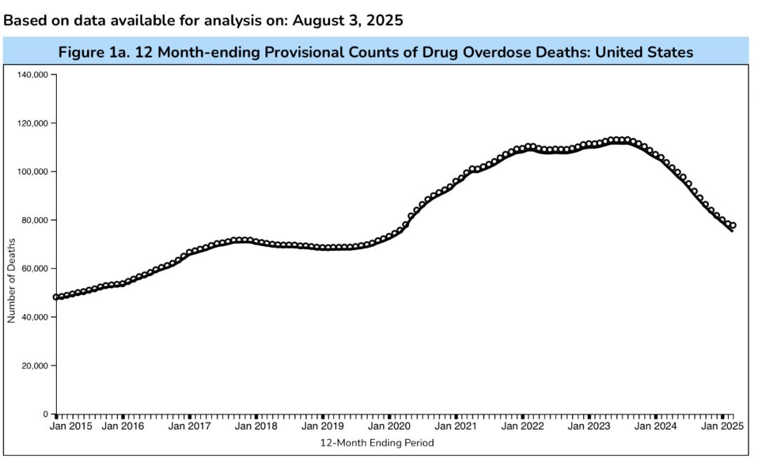 甲苯噻嗪并不是美国药物致死数据下降的唯一原因。2024年美国药物过量死亡人数确实大幅下降至2019年以来的最低水平,也是自1990年代阿片类药物危机爆发以来最显著的下降之一。