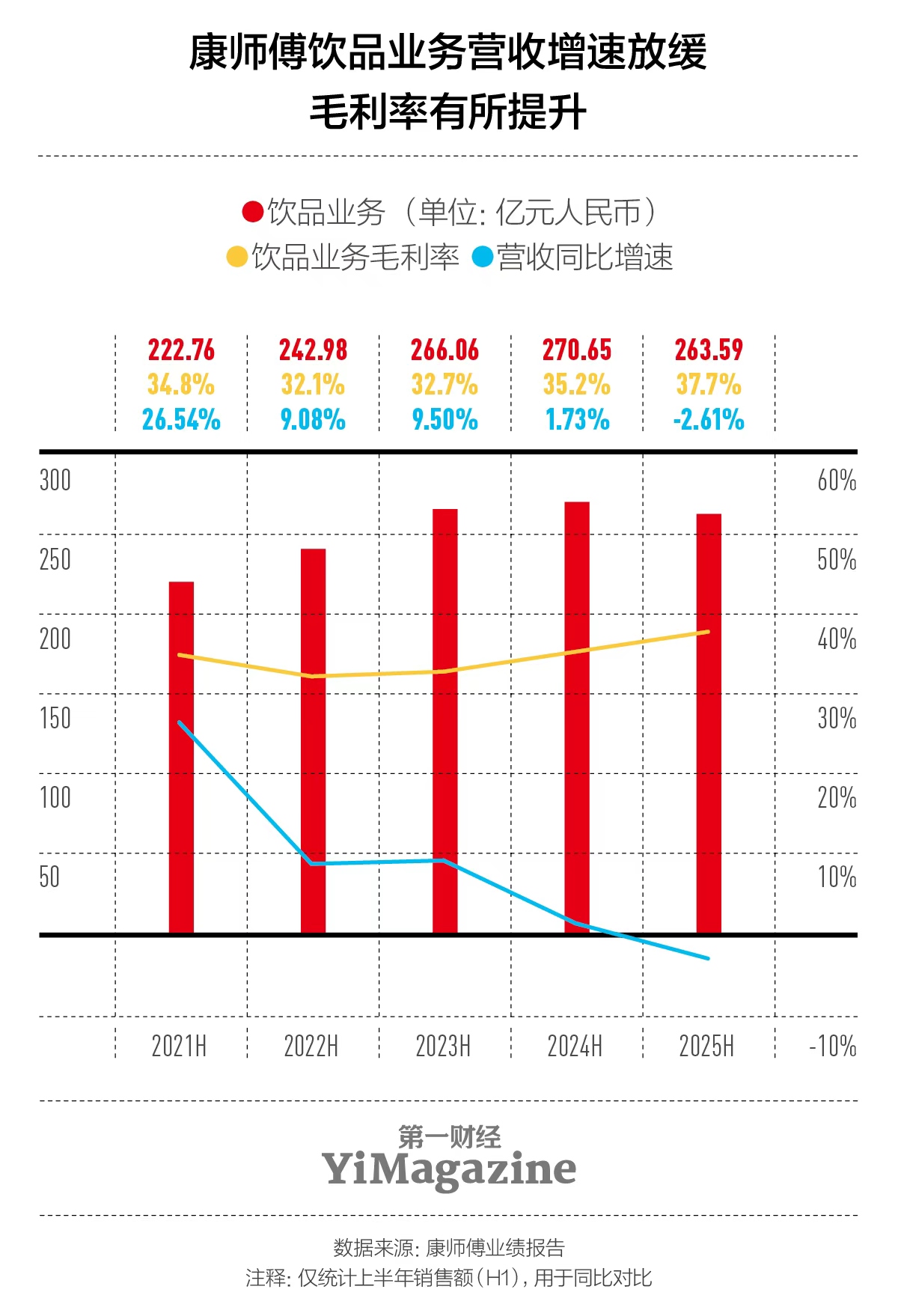 从2021年至2024年上半年,康师傅饮品营收连续增长,但同比增速逐年放缓,2025年上半年首次出现营收同比下滑。与之形成反差的是,饮品的毛利率持续攀升,在2025 年上半年达到37.7% ,创下近5年同期新高。