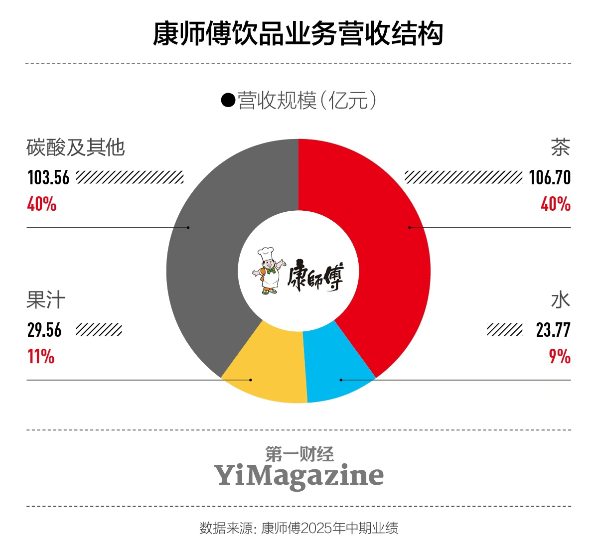 康师傅2025年中期业绩报告显示,截至2025年6月30日,营收约为400.92亿元,同比下降2.7%。方便面和饮品是康师傅的两大支柱型业务。其中,饮品营收为263.59亿元,同比下滑2.61%——这是康师傅最近5年以来,饮品营收首次出现下滑。