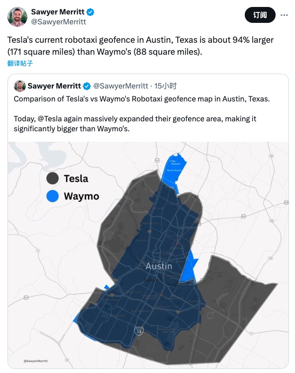 🚗 特斯拉Robotaxi在奥斯汀的地理围栏范围再次扩大,此次扩张使其服务区域远远超过了竞争对手Waymo,显示了其在无人驾驶出租车市场上的领先地位。新的服务区域覆盖了奥斯汀市中心及郊区约171平方英里,相比之下,Waymo的服务区域为90平方英里,特斯拉的覆盖范围是Waymo的两倍多。