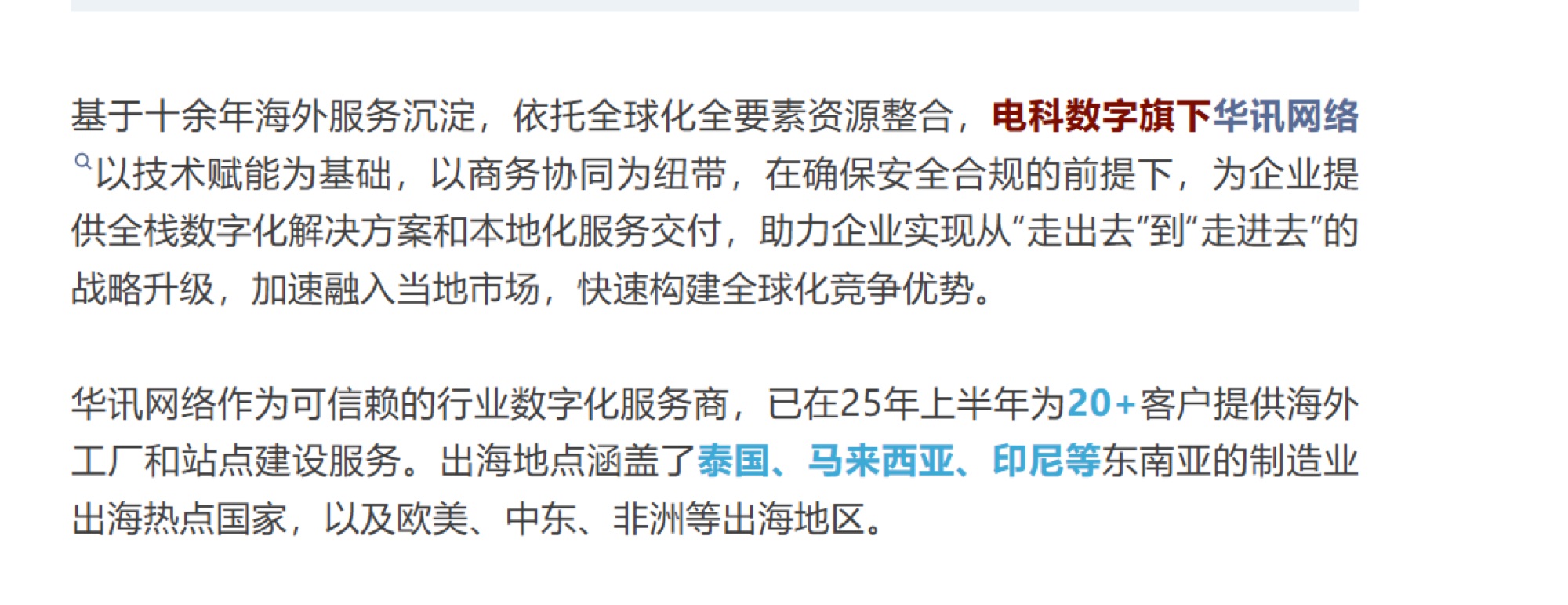 电科数字的股票代码为600850,实际控制人为国务院国有资产监督管理委员会。公司主营业务涵盖数字化产品、行业数字化和数字新基建三大板块,致力于为客户提供全面的数字化解决方案。 财务状况 • 营收增长:2025年上半年,公司实现营业收入48.55亿元,同比增长7.56%,业务保持着规模化的稳健增长态势,各业务板块均有不同程度的增长。 • 数字化产品业务:2025年上半年收入与去年同期持平,但新签合同同比增长41.82%,增长潜力较大。 • 行业数字化业务:是公司的主要收入来源,2025年上半年实现