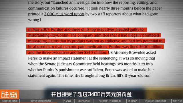 这三位高管认罪,接受了超过3400万美元罚金。而普渡公司则承认其“出于欺骗或误导意图”,错误宣传奥施康定“成瘾性较低、滥用风险较小”,与传统止痛药相比“更安全”,因而同意支付超过6亿美元的罚金。