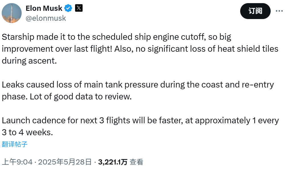 虽然公司尚未公布后续的安排,但SpaceX首席执行官马斯克曾在5月表示,未来3次试飞的节奏会更快,大约每隔3-4周一次。