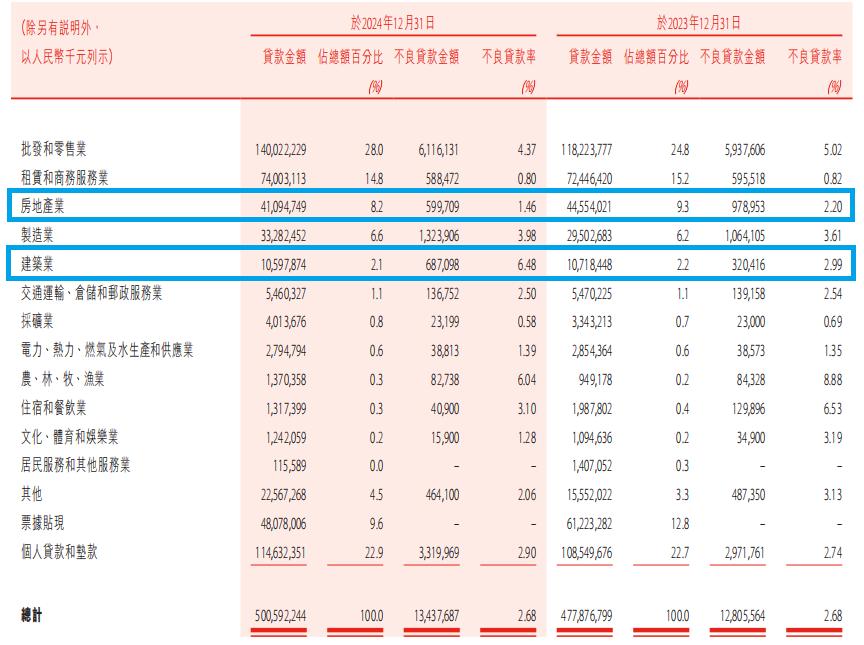 截至2024年12月末,盛京银行对房地产业的贷款投放约411亿元,占贷款总额的8.2%,不良贷款率为1.46%;对建筑业的贷款投放约105.98亿元,占贷款总额的2.1%,不良贷款率为6.48%,为该行贷款投放行业的最高不良贷款率。