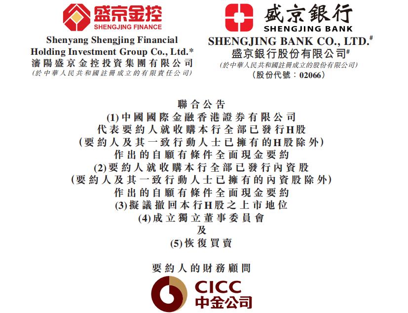 8月26日晚,盛京银行发布公告,沈阳盛京金控投资集团(下称“盛京金控”)及其一致行动人,发起现金要约收购盛京银行其余全部已发行H股及内资股。