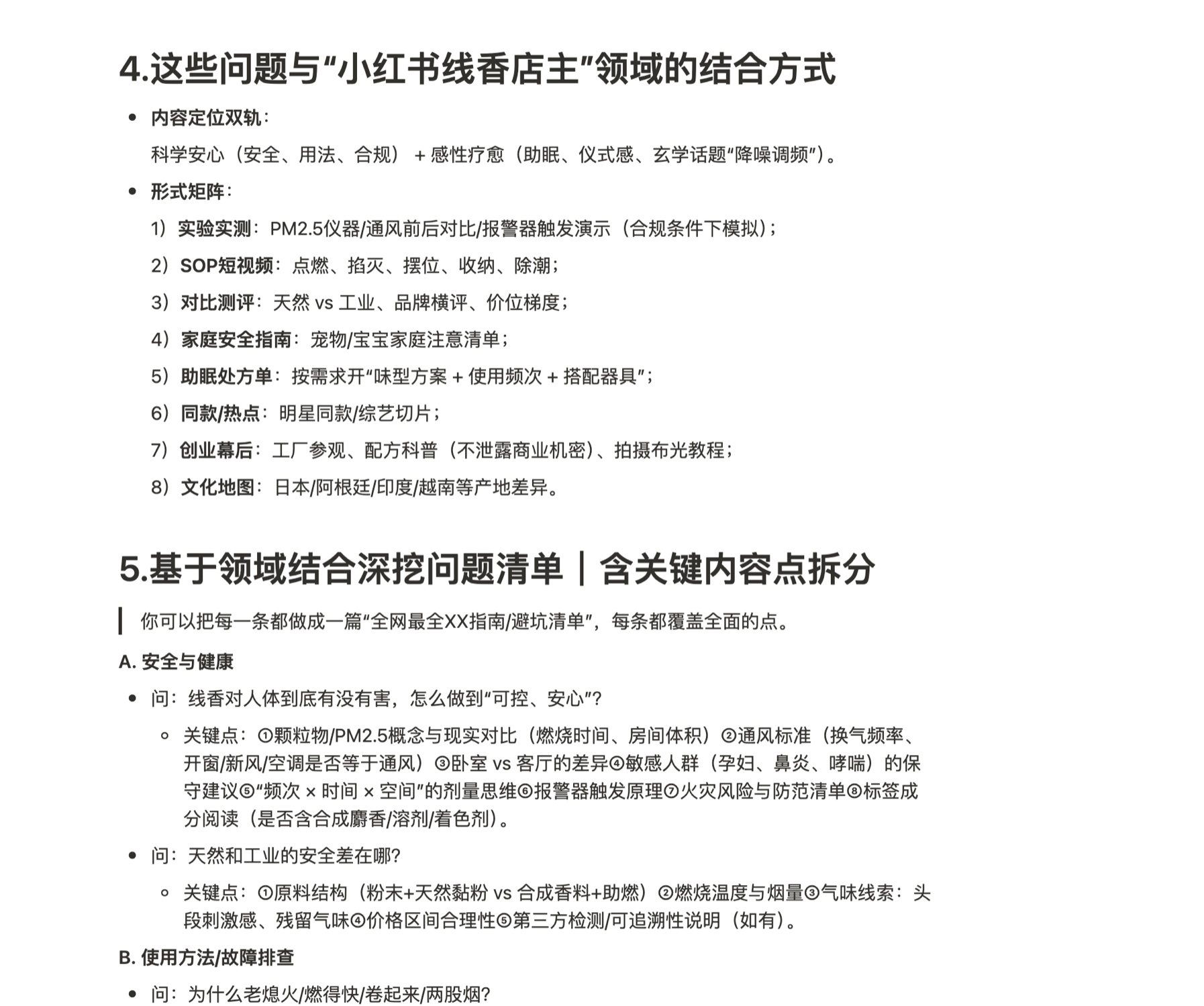 本文介绍了一个利用AI分析小红书用户搜索关键词,以发掘店铺营销痛点和优化选题的实用技巧。通过洞察用户搜索的“线香推荐”、“线香危害”、“线香创业”等热词,AI能够精准识别目标用户群体对产品效果、健康影响、使用方法乃至创业机会的关注点。文章详细阐述了AI如何从用户痛点出发,模拟用户提问,并将这些痛点与线香店铺的运营领域相结合,最终产出一份月度内容选题计划。该方法旨在帮助小红书店主更有效地吸引用户,提升店铺的吸引力和转化率。