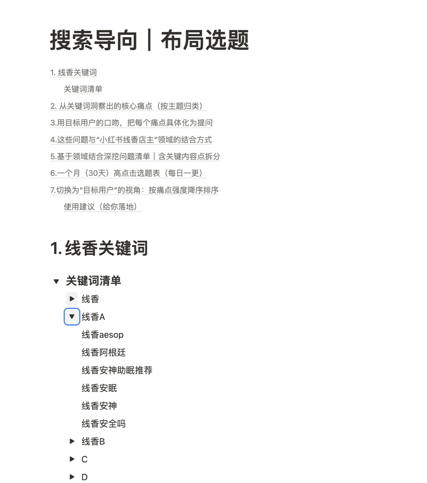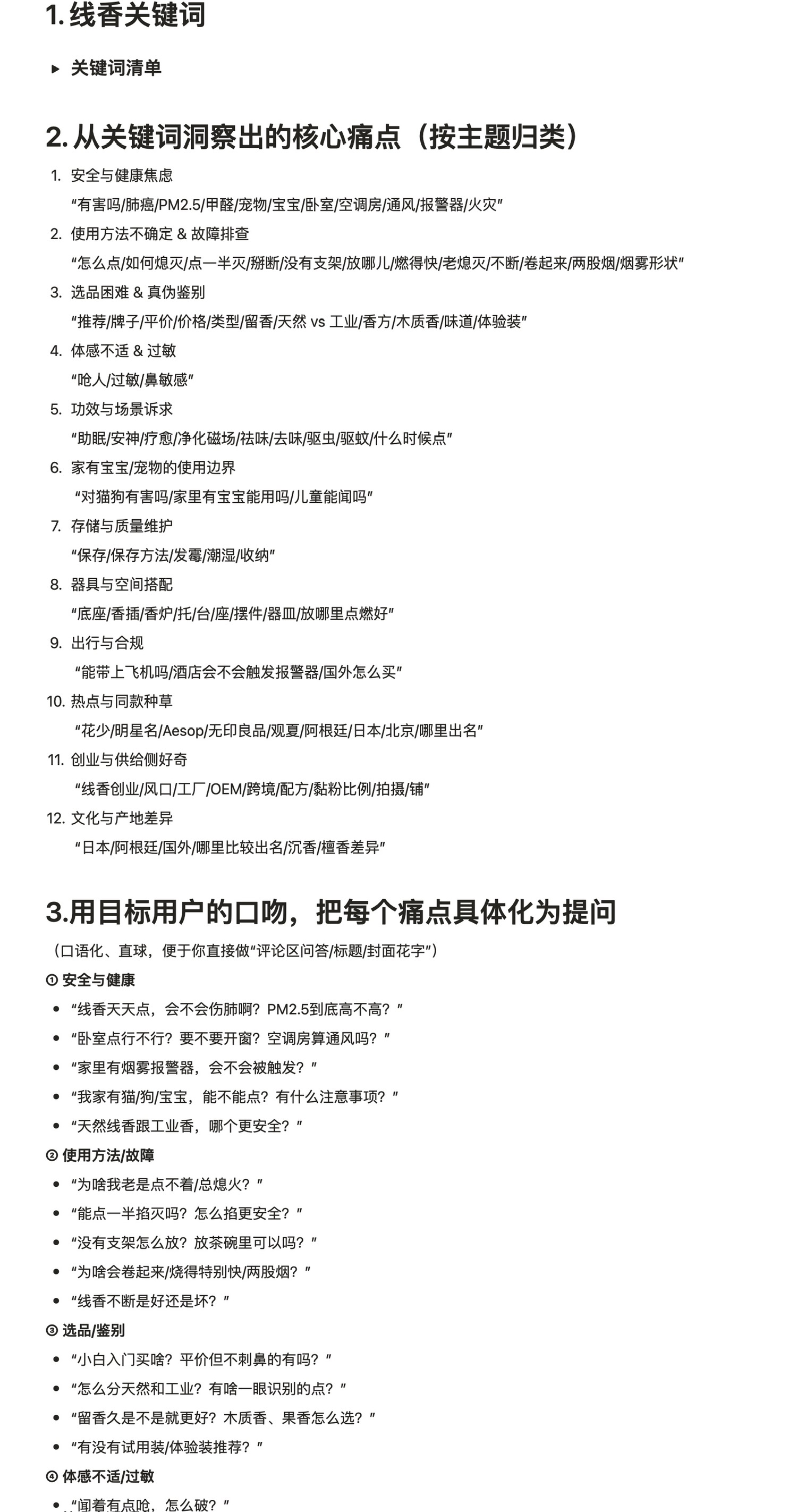 我是一个线香赛道的小红书店主,我的目标人群是购买线香和熏香的人,我在小红书上搜到大家搜索的关键词如下:线香推荐