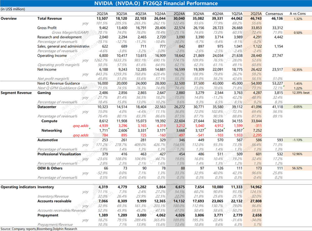 1. 核心经营指标:总收入467亿美元,市场预期461亿美元,其中季度环比增长27亿美元,主要是受数据中心业务和游戏业务的带动。毛利率72.4%,市场预期71.9%。