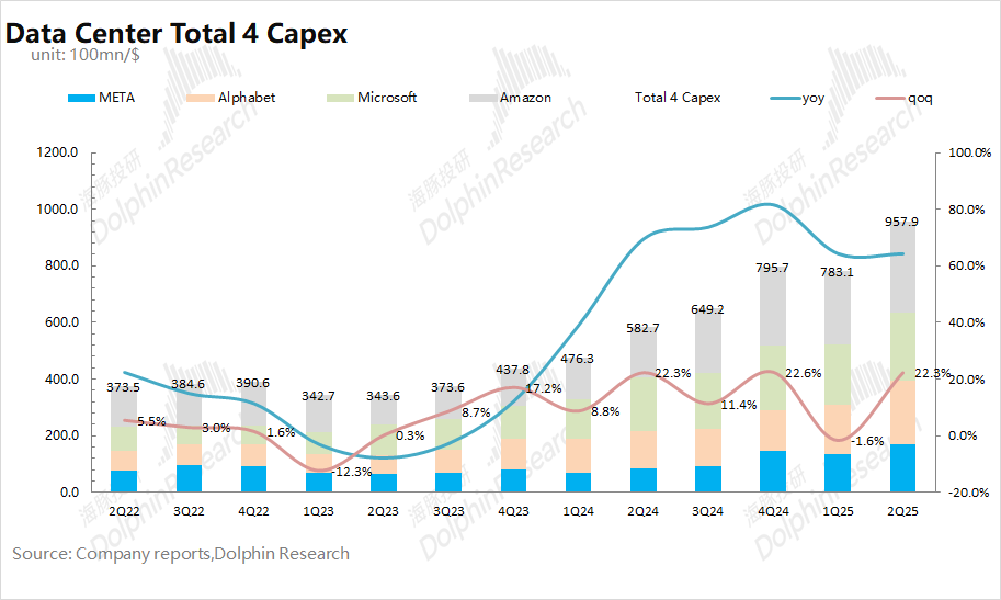 通过与四家公司的管理层交流,海豚君预期,四大厂商在2025年的资本开支有望达到将近4000亿美元,同比增长58%,这也为公司下半年业绩的持续增长带来保障。