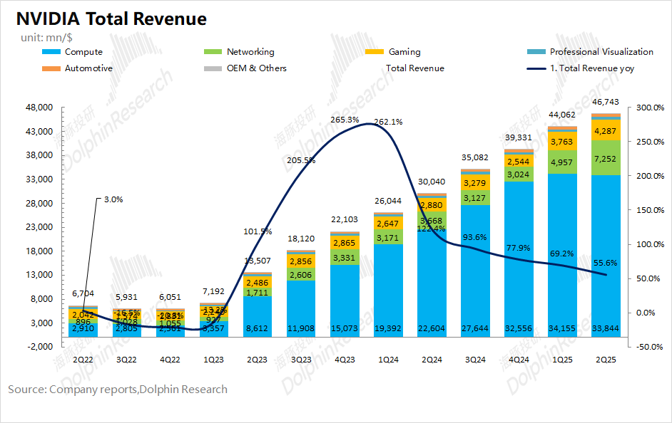 本季度增长主要来自数据中心和游戏业务带动,其中,游戏业务在RTX50系列产品的带动下表现超预期;而受H20禁令影响,数据中心业务环比仍有20亿美元的增长,业务表现符合市场预期。