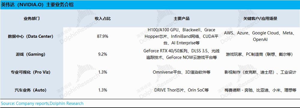 (1)数据中心业务:是当前最主要的关注点,其主要产品包括H100、A100、Blackwell等算力芯片,公司的核心客户是亚马逊、微软、谷歌等云服务大厂;