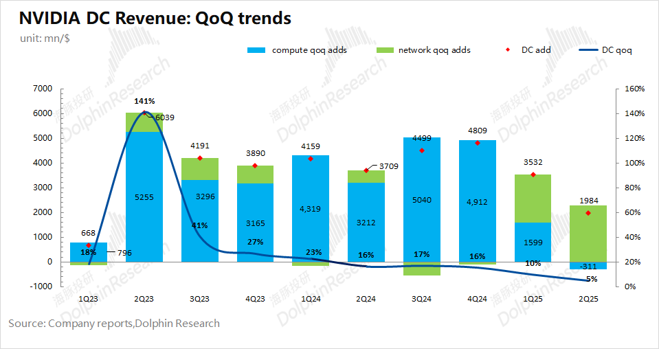 本季度数据中心业务的环比增长,主要来自网络业务的带动,而计算业务受H20影响的部分大约有40亿美元。若剔除该影响,计算业务收入本季度环增有将近35亿美元左右。