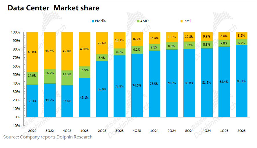 由于当前在数据中心市场,英伟达、AMD和英特尔仍是核心芯片的主要玩家,将三者相关业务对比,可以看出:凭借公司领先的算力产品,英伟达在数据中心市场的份额在持续增长。