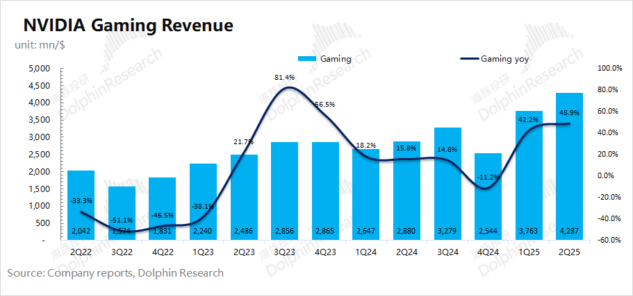 3. 游戏业务:本季度收入42.9亿美元,同比增长49%,主要受益于公司推出的RTX50系列产品的带动。相比于AMD单季度约10亿美元的收入,英伟达在游戏显卡市场仍具有明显优势。