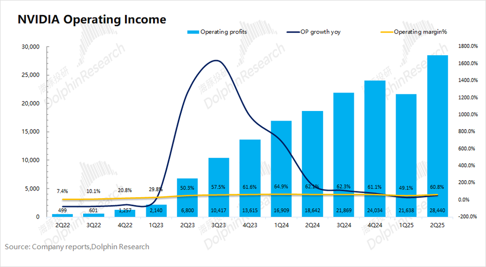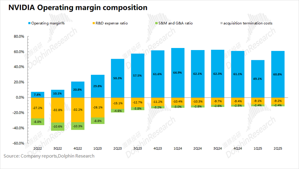 2026财年第二季度,英伟达核心经营利润率为60.8%,明显回升。公司上季度受H20存货减计的计提费用影响,毛利率出现了“闪崩”。