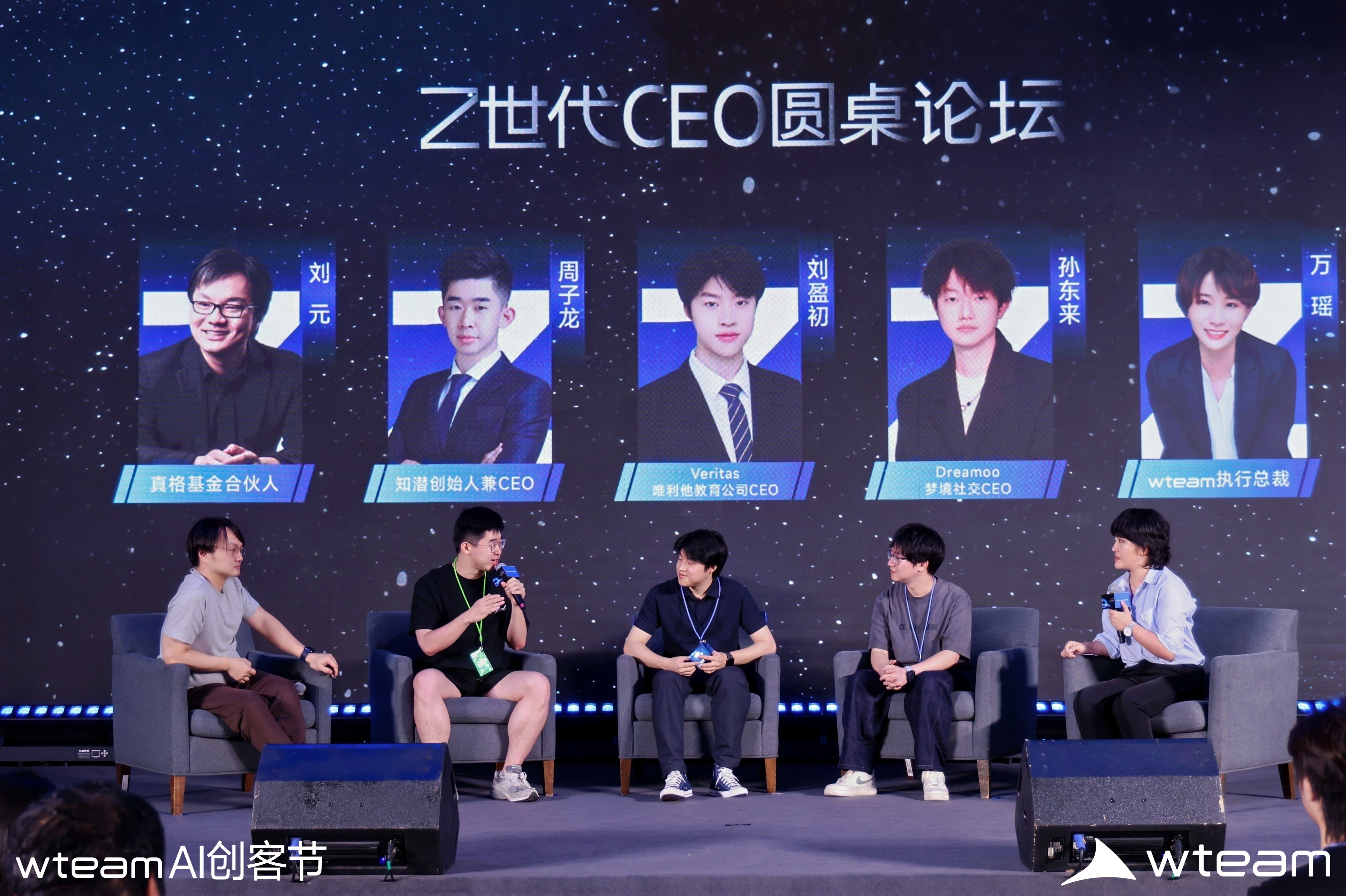 在wteam执行总裁万瑶的主持下,知潜创始人周子龙、Dreamoo梦境社交CEO孙东来、Veritas唯利他教育公司CEO刘盈初等Z世代创业者在圆桌对谈中以更多元的视角和思考方式,拆解 “技术理想与商业落地” 的平衡之道。