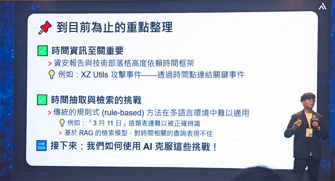 謝沛錫更是舉出多個實際案例,突顯語言表達的複雜性與格式多樣性,以說明從資安報告提取時間資訊所面臨的挑戰。