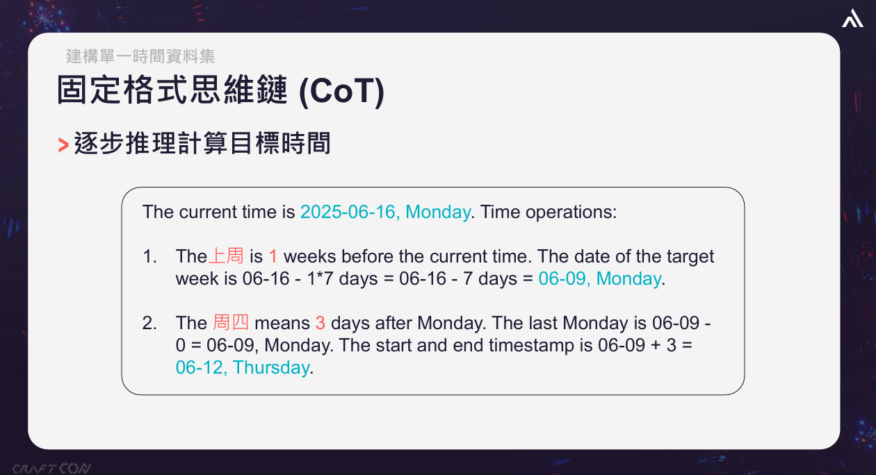 例如,解析「上週四」時,模型會先列出關鍵詞,再拆解為年、月、星期等描述,最後逐步計算出具體日期,透過這種方法可以提高了推理的準確度,得到正確的開始時間與結束時間,使用get_time_specific的函式格式化時間資訊,方面後續處理。