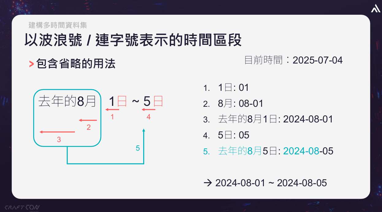 (五)波浪號與連字號、縮寫與省略。談完單一時間資料集,由於一句話中也會出現多個時間資訊的描述,因此合成多時間資料集也是不可或缺的一環。以去年8月1日~5日的描述為例,這裡就要讓模型能識別「5日」是指去年8月5日,要讓模型知道這種省略的用法