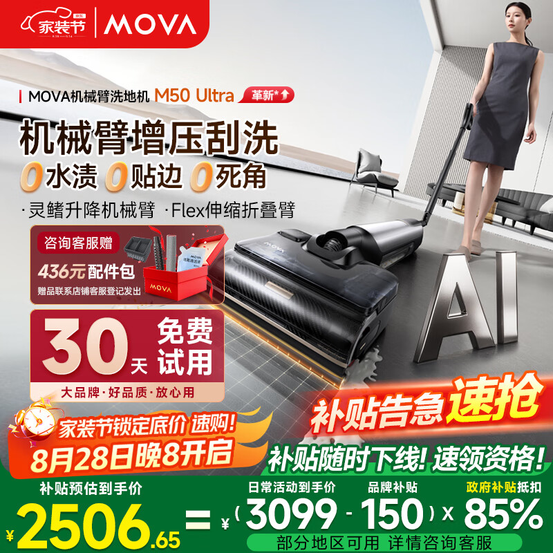 今年 4 月份,MOVA M50 Ultra 洗地机正式发布,定位机皇,国补后 2506 元起,带来了灵鳍升降机械臂、智能清洁液系统、AI 全域无极助力、Flex 伸缩折叠臂等创新科技。