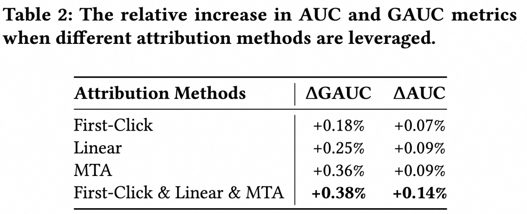 在上述模型架构下,我们以Last-Click归因机制为目标归因机制进行实验,对比了不同归因机制所产标签作为辅助目标时对主目标预估准度的增益。如下表所示,我们得到两项关键观察: