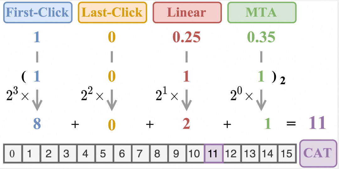 受上述观察2启发,我们希望构造比单一归因机制所产标签更复杂的辅助目标,进一步提升模型效果。为此,我们设计了笛卡尔积辅助训练任务(Cartersian Auxilliray Training,简称CAT),作为一个难度更高的额外辅助任务加入归因知识聚合模块AKA中。如下图所示,CAT辅助任务的目标由各种归因口径产出的二元转化标签取笛卡尔积得到,当系统中存在4种归因机制时,CAT就是一个